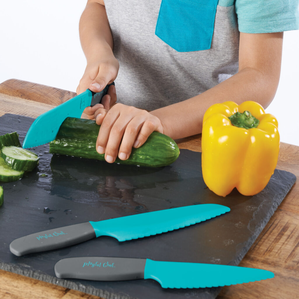 Kid-safe knives like Playful Chef (or similar safety tools) are a game changer. Designed to cut soft foods—lettuce, cucumbers, tomatoes, cheese—without real risk, they allow preschoolers to chop independently.