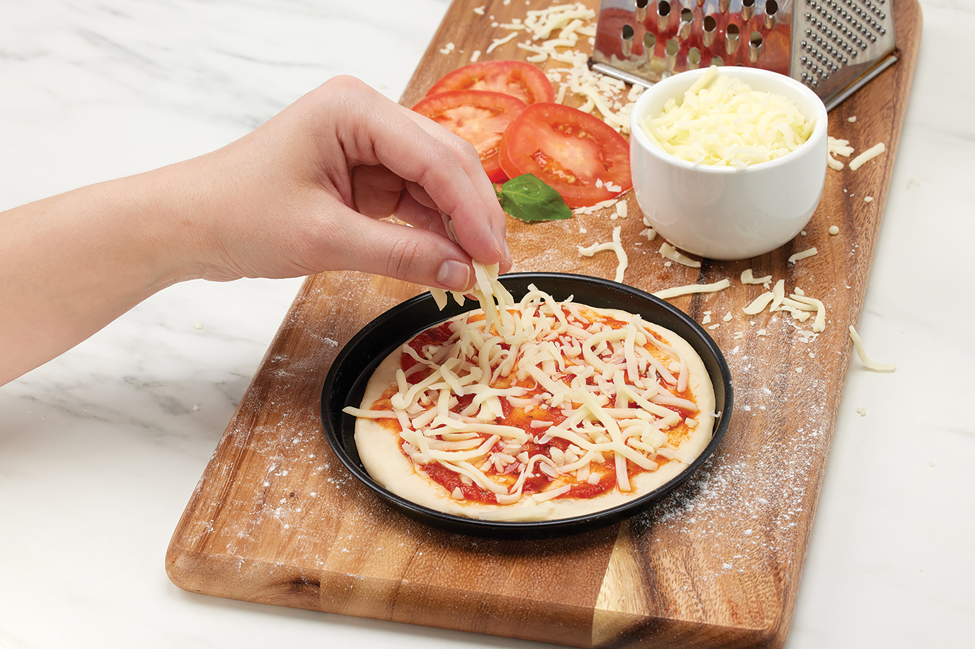 - Measure Mozzarella Cheese and Sprinkle Evenly on the Pizza– Sprinkle the Parmesan on top of the Mozzarrella– Taste a bit of the mozzarella and a bit of the parmesan to note the difference in textures and flavors.– The Mozzarella with be gooey and bubbly when it melts, and the Parmesan will be brown and crunchy. – Add any additional ingredients that you feel would taste great on your pizza.